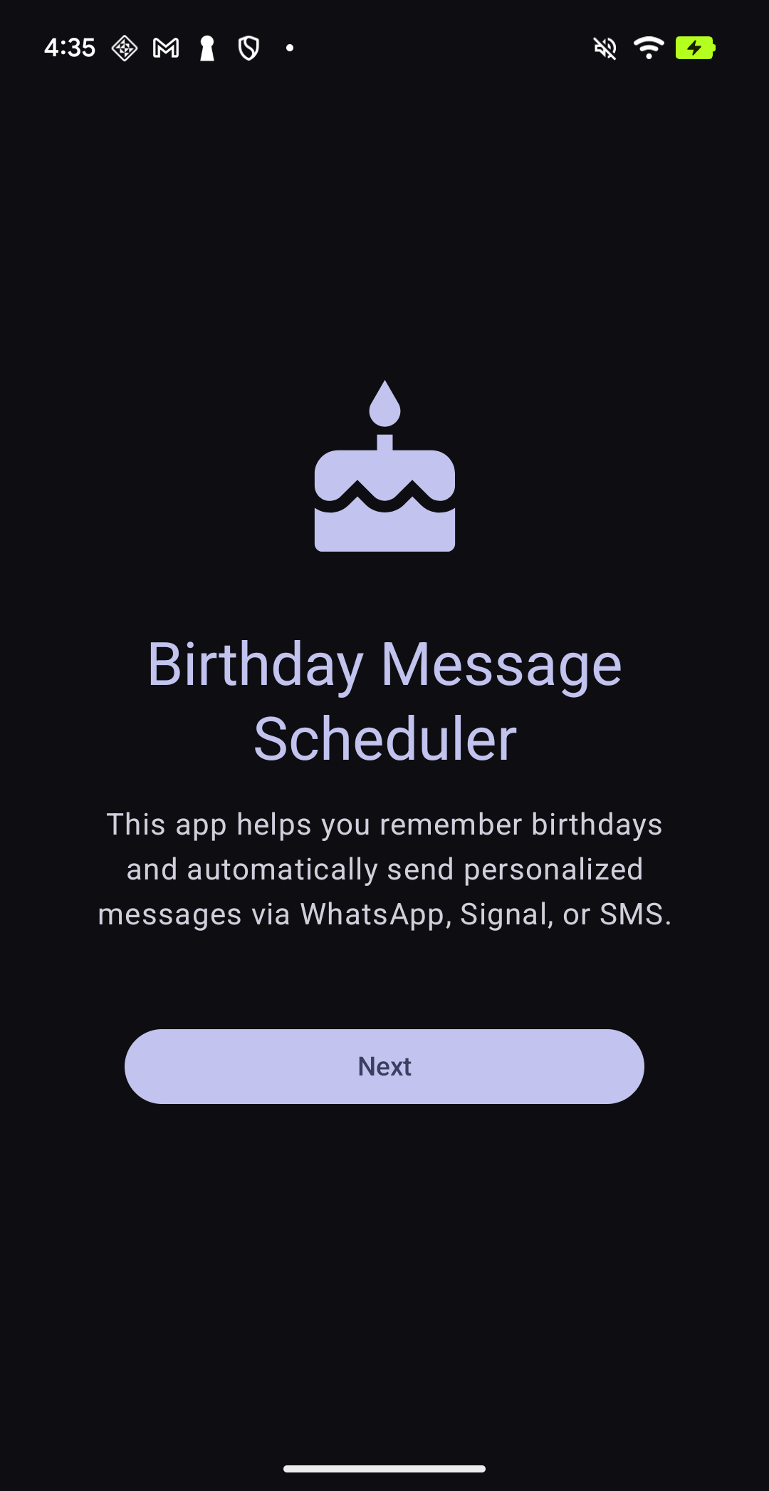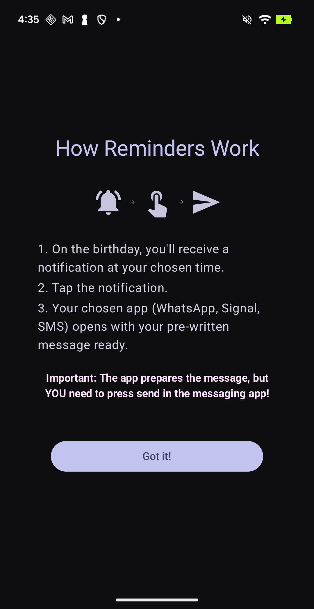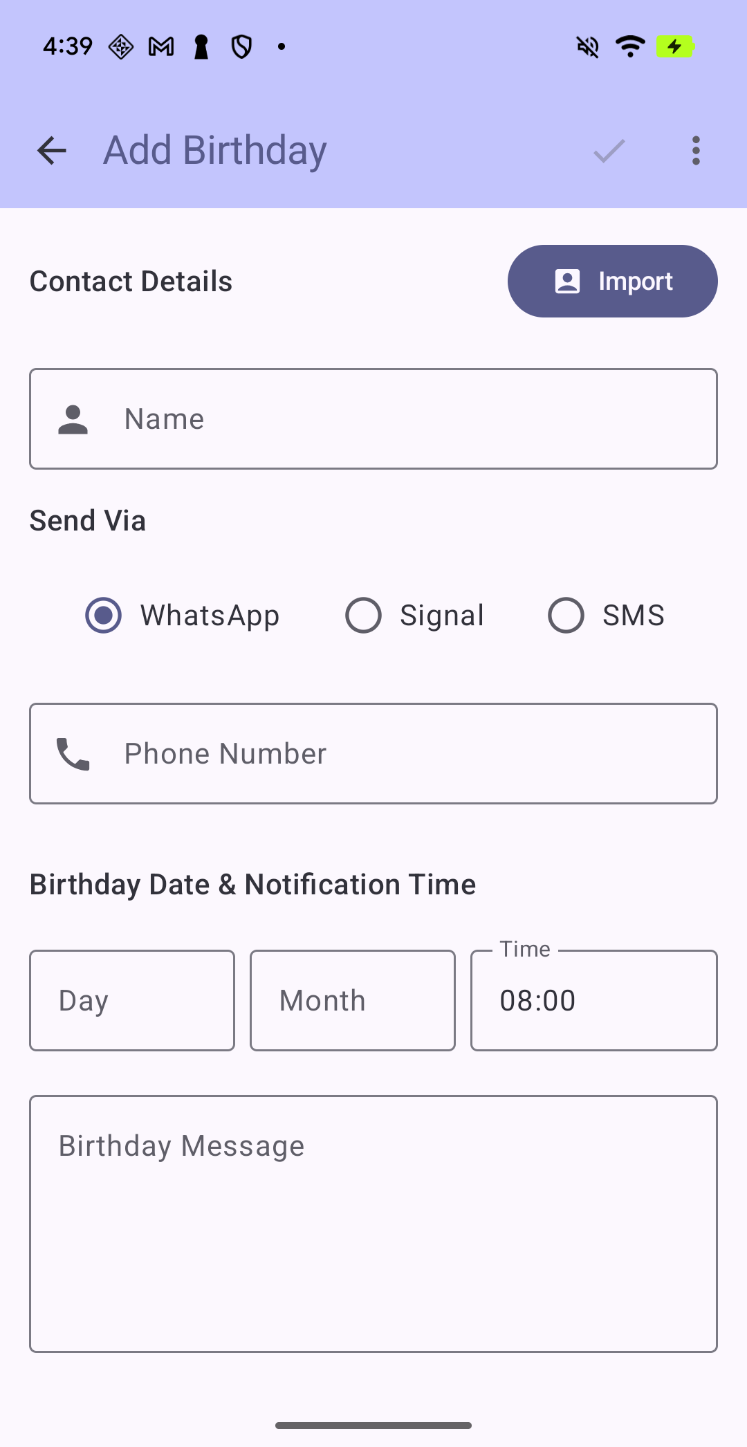 The App stores the data you enter (such as contact names, birth dates, notification times, and prepared messages) directly and solely on your device. We do not collect or store this personal information on our servers.